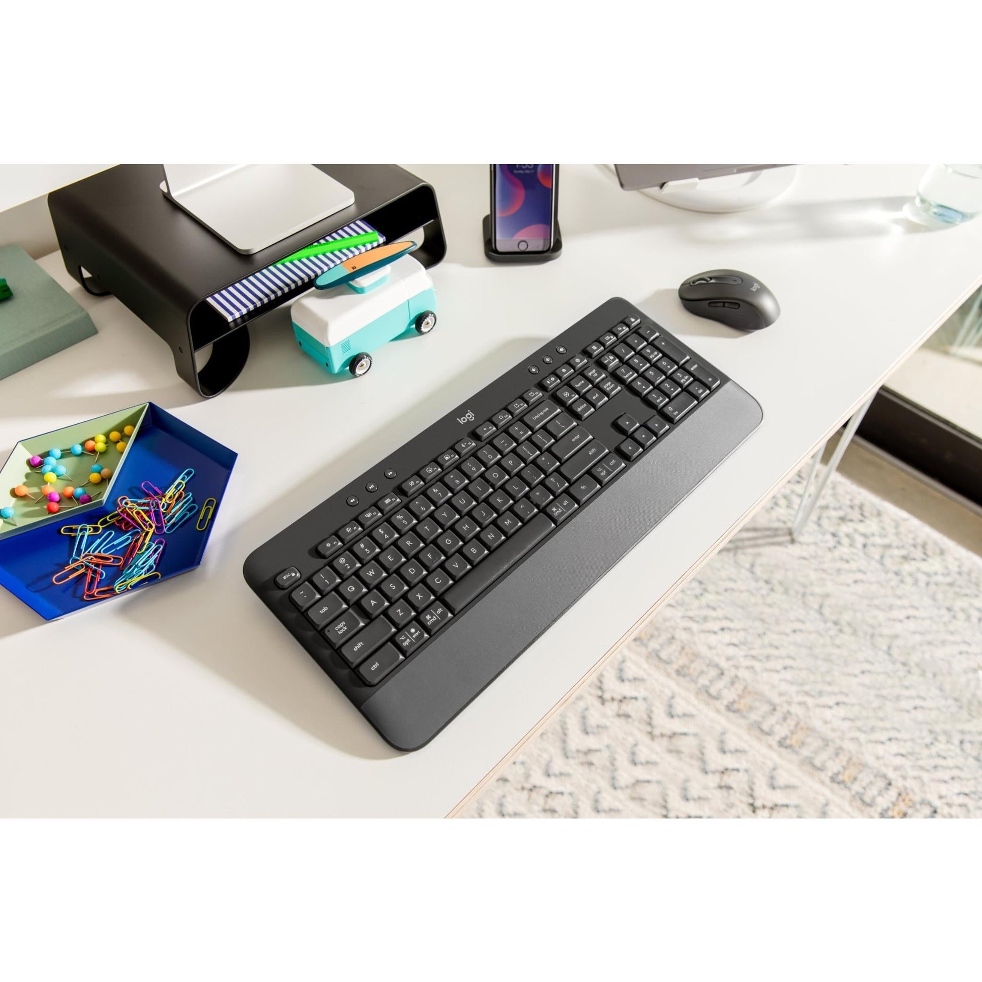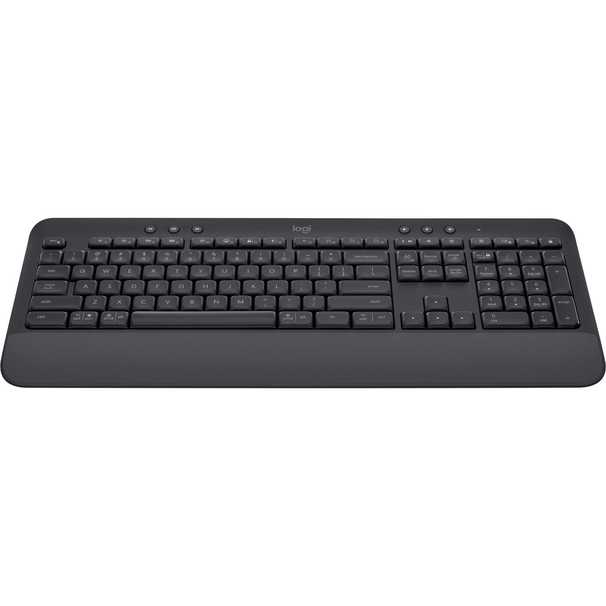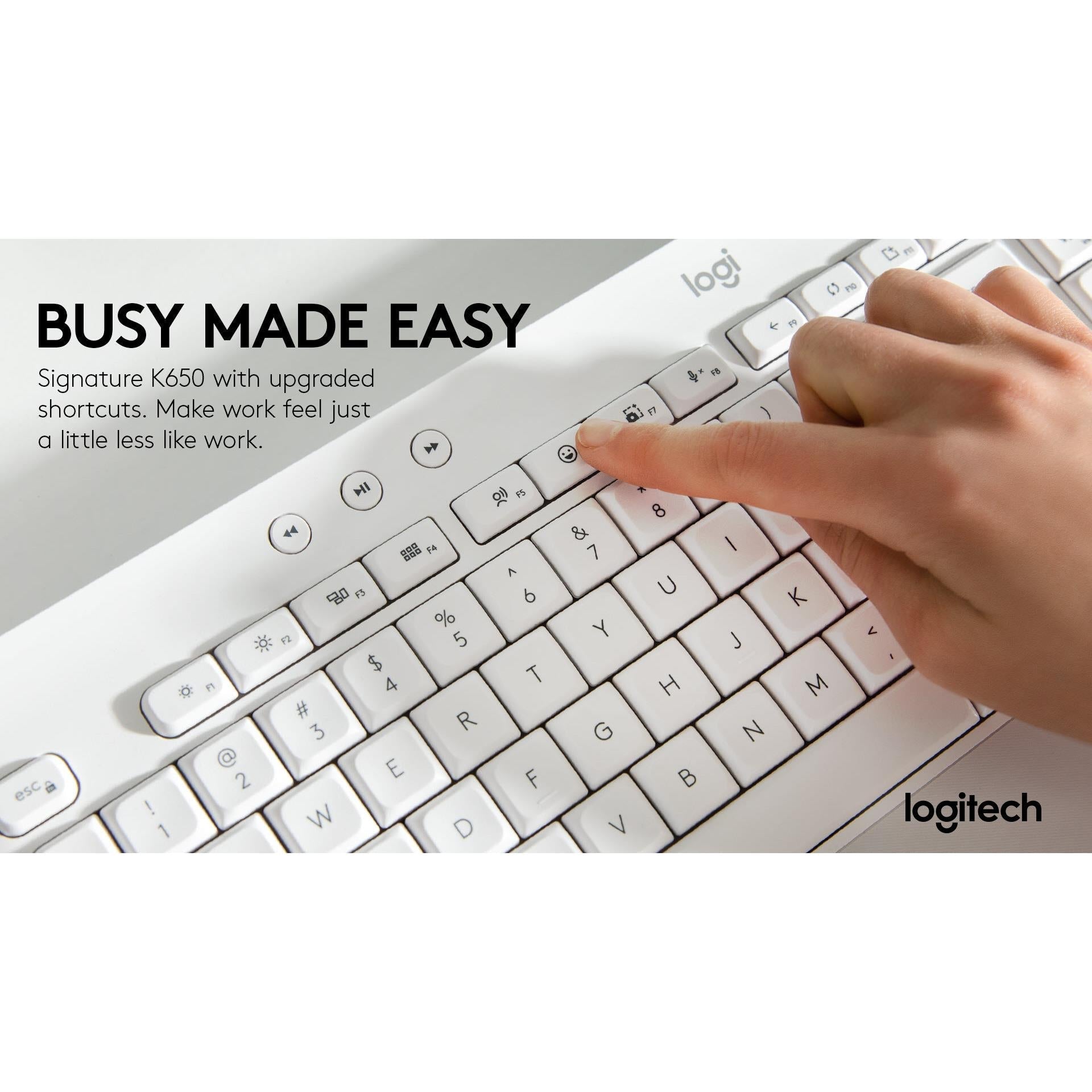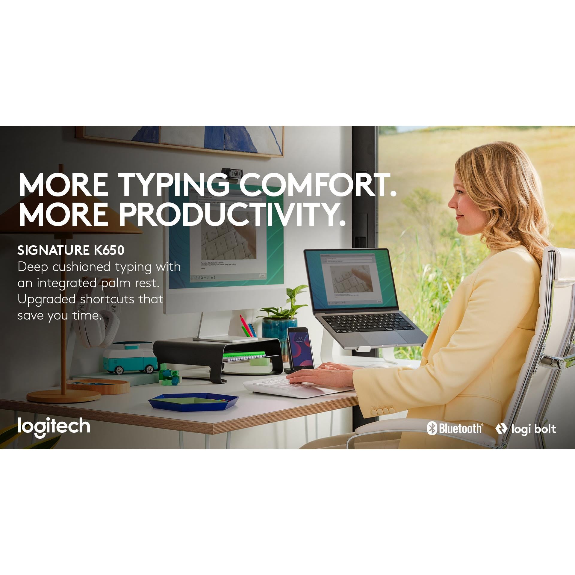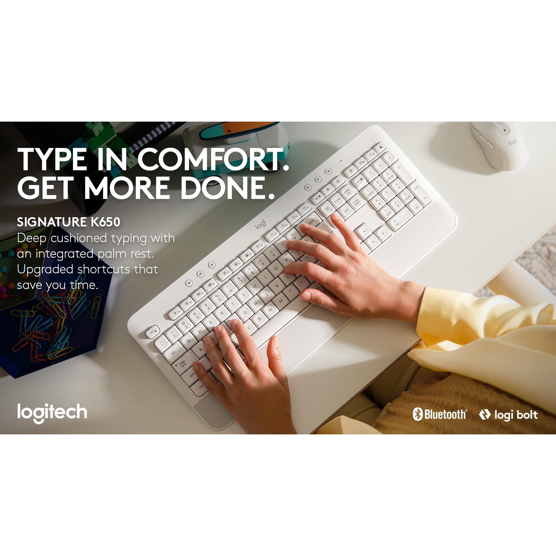 Signature K650 Wireless Comfort Keyboard Integrated soft-touch palm rest, Deep-cushioned keys and familiar typing feeling. Full-size layout with numpad. Time saving shortcuts: mic mute and unmute, screenshot, web navigation. Connect with Bluetooth® or Logi Bolt USB Receiver. Up to 36-month battery life and spill-resistant. Works with Windows, macOS, Chrome OS, Linux, iPadOS and Android devices.